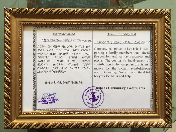 近期,在我办事处所在地社区居民Alemayehu Bekele家不幸遭遇无情火灾、家庭陷入极度困境的时刻,江西水建驻埃分公司向其伸出援手,助其迅速重建家园。事后,Gotera社区协调员及警察所官员一行为我公司这种义举表示赞赏并颁发了感谢证证书。