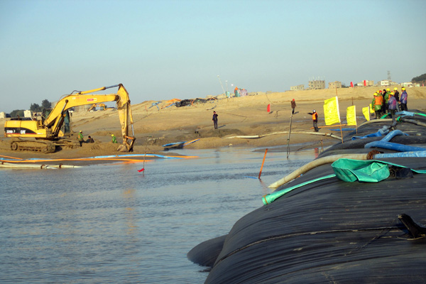 为了向当地人民交上一份合格的答卷,公司以高度的责任感认真组织建设,开动脑筋、攻坚克难,在项目部的精心组织下,通过项目部全体人员的努力,目前工程进展较为顺利,在原有的荒滩上显露出勃勃生机。春节前,项目部又发起了新一轮施工的攻坚战,力争右侧及上下游围堰达到设计高程,左侧围堰稳步推进,为年后围堰防渗墙施工创造有利条件。