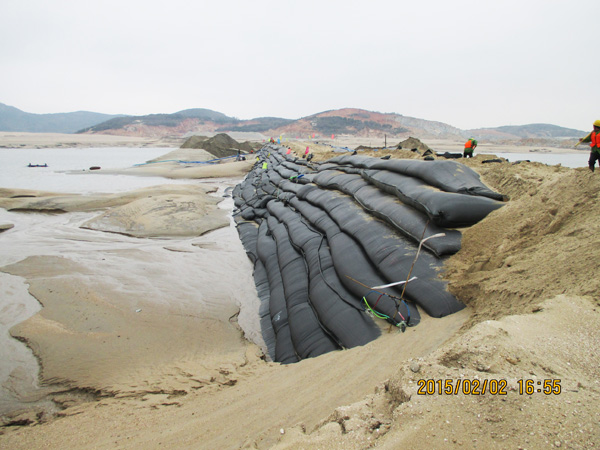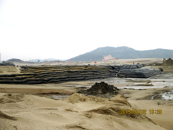 平潭综合实验区,主岛为海坛岛,位于福建省东部,与台湾隔海相望,是中国大陆距离台湾岛最近的地方,是中国第五大岛,有福建的“马尔代夫”之称。平潭综合实验区如意湖防潮闸工程项目总投资1.3亿元,我公司承建的土建工程包括排涝闸、防潮闸、公路桥、上下游两岸翼墙、防冲消能、控制房等土建工程施工(含导流明渠开挖、围堰填筑)。平潭(简称岚)年平均风速超过五级以上,大风呼啸,没来这里感受不到风有多大!依据工程设计及进度要求,在落差8m潮汐中的软基上进行围堰模袋充砂以截流海水,在恶劣地质条件的海中建闸,与潮水赛跑、跟台风抢工期,潮起潮落,给工程建设平添了许多艰难与艰辛。