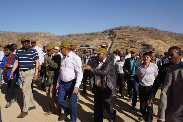 下午3时许,总统、总理和议长抵达工地后,就顶着40度的高温马不停蹄赶往主坝和灌溉隧洞引水渠,详细视察现场情况。承包商Sur公司负责人Tadesse Yemane向三位领导报告了工程概况和现场进度,并介绍了整个大坝防渗的关键部分——基础灌浆和沥青混凝土芯墙——是由江西水建承建的。公司项目经理黄生宝向三位领导简要汇报了灌浆项目的完成情况,并表达了又好又快完成沥青混凝土芯墙和灌溉隧洞的坚定决心和信心。领导们对我公司的成绩表示肯定,希望我们再接再厉、优质高效地完成接下来的工作,为早日实现蓄水和灌溉做出努力。