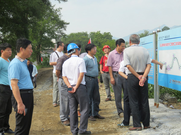 为进一步落实8月8日全省水利建设推进会精神,2014年9月21日上午,以水利厅副厅长廖瑞钊为组长的督查组来到我公司承建的上饶市玉山县樟村镇防洪工程现场检查指导工作。督查组一行深入工地全线施工现场,每到一处都详细询问各参建单位情况,了解工程的投资规模、设计方案及进度、质量控制情况。督察组对樟村镇防洪工程施工质量尤其是工程外观表示非常满意。在看了工地整齐规范的五图一牌及公司形象宣传栏后,廖瑞钊副厅长对我公司的标准化施工管理给予了高度评价,还不时拍照记录,并要求玉山县水利局在全县其他水利建设工地参照学习并加以推广。在检查完工地现场后,督察组在樟村镇政府就防洪工程设计、施工、及乡镇规划召开了座谈会。
